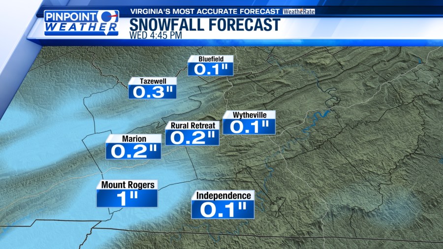 ROANOKE, Va. (WFXR) — A wave of energy will drop into the region overnight, with snow showers possible for areas mainly west of Interstate 77. Accumulations for the higher peaks will be less than half an inch, with a dusting possible in the valleys. Mount Rogers could see up to one inch at the summit.