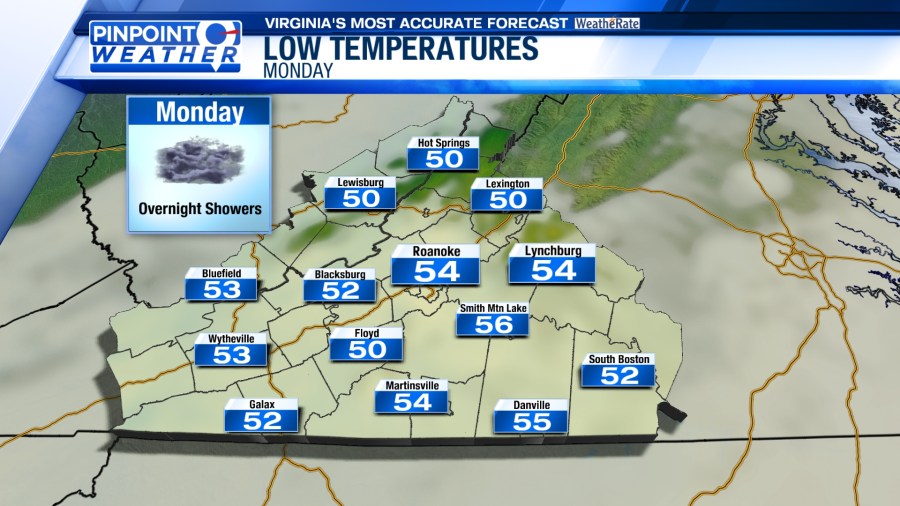 Monday morning lows will be in the 50s with daytime highs around 65-75 degrees.